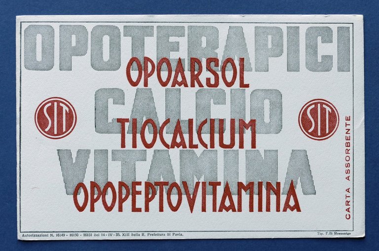 Pubblicità d'epoca Farmaceutica Carta Assorbente -  Opoarsol - Tiocalcium - Opopeptovitamina - 1935 ca. Dimensioni: 14,5 x 22 cm ca. Condizioni buone.