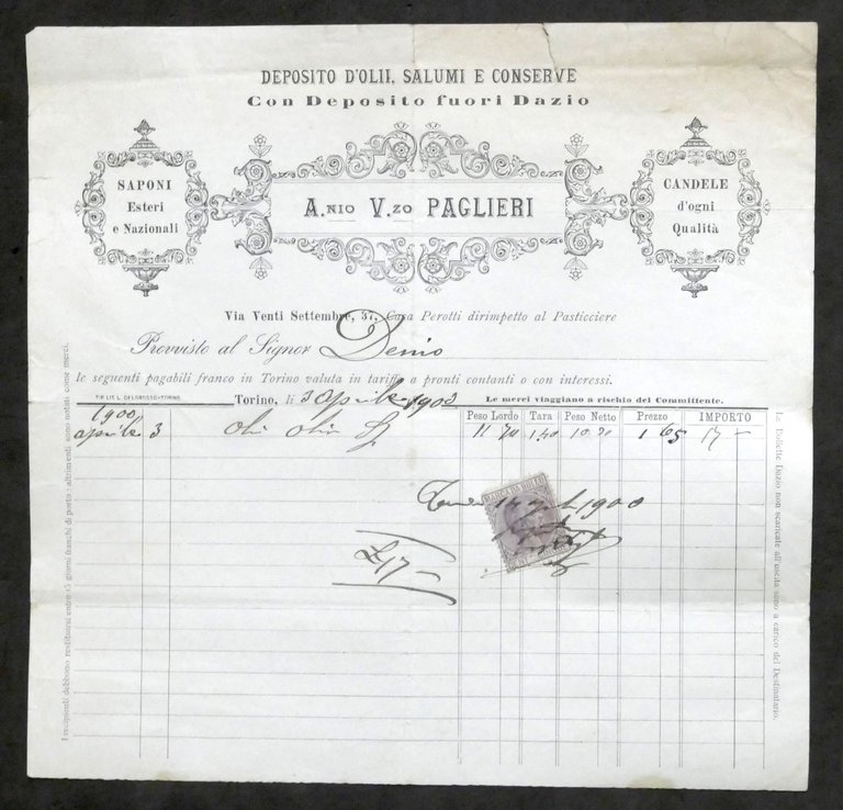 Pubblicità Fattura - Deposito d'olii, salumi e conserve Paglieri - Torino - 1900 | Libri antichi e moderni |