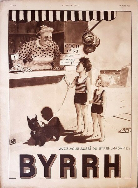 Stampa tipografica in toni di marrone e beige, dim. L. 27,5 x 38 cm. proveniente dalla rivista francese L'ILLUSTRATION (agosto 1931) - Didascalia: Avez-vous aussi du Byrrh, madame? - BYRRH.