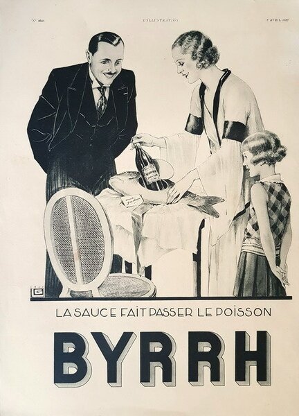 Stampa tipografica in toni di nero e grigio, dim. L. 27,5 x 38 cm. proveniente dalla rivista francese L'ILLUSTRATION (aprile 1932) - Didascalia: La sauce fait passer le poisson - BYRRH.