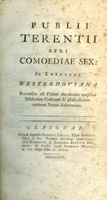 In-8° (200x119mm), pp. (1), 280, legatura coeva p. pelle marrone con titolo oro su tassello e ricchi fregi ornamentali pure essi impressi in oro al dorso. Tagli rossi e sguardie marmorizzate. Segnacolo in seta verde. Glosse marginali di mano coeva inerenti al testo a numerose pp. Qualche brunitura e fioritura, ma ottimo esemplare. Bella edizione di Glasgow delle commedie di Terenzio, basata sul testo fissato dal Westerhovius nel 1726. Ogni commedia è preceduta dalle perìoche di Sulpicio Apollinare e da un sunto della commedia stesa del Mureto (Marc Antoine Muret). Brunet, V, 717. Graesse, VII, 61. Renouard, Catalogue de la bibliothèque d'un amateur, II, 317.