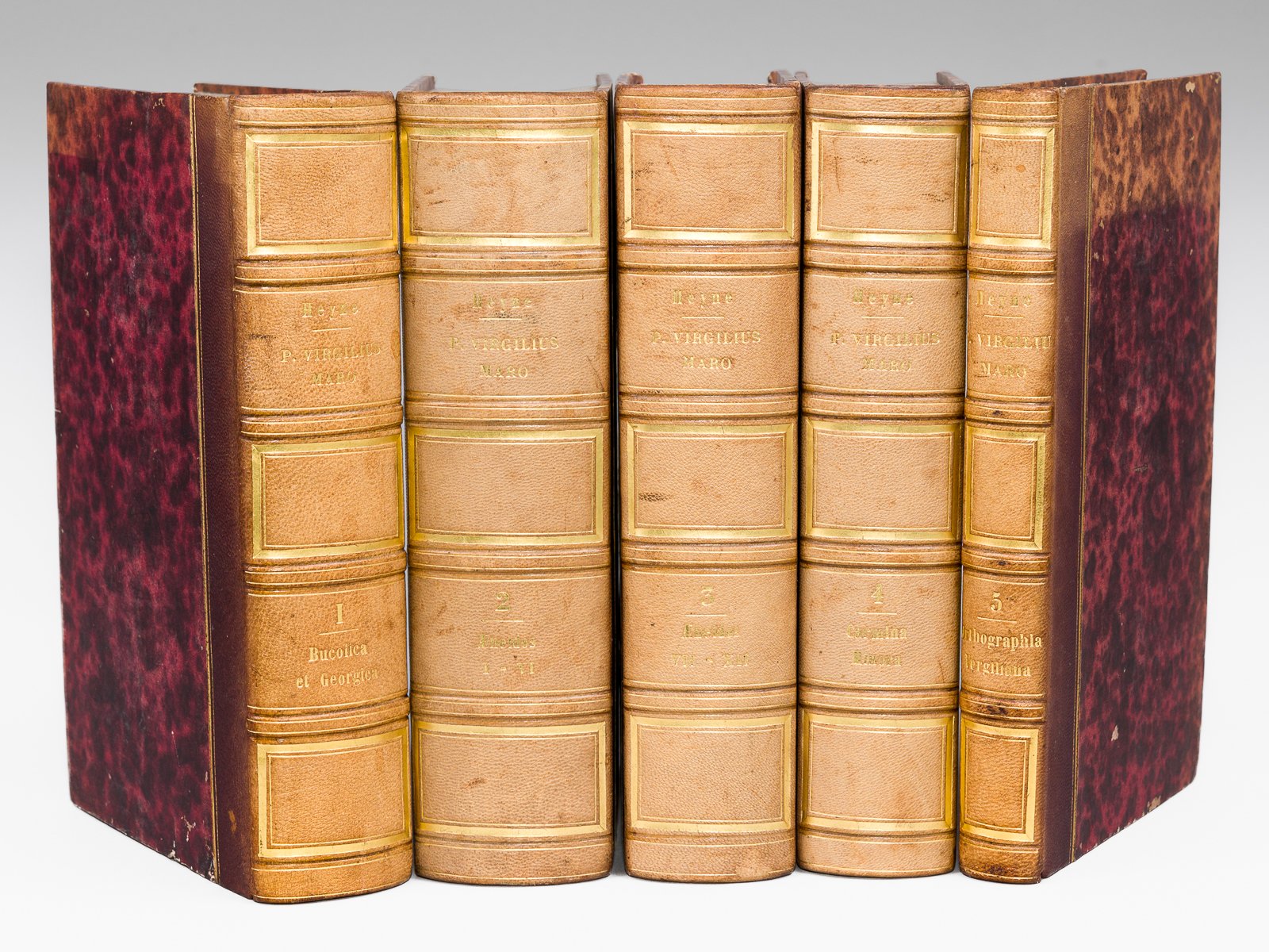 Publius Virgilius Maro varietate lectionis et perpetua Adnotatione illustratus a Christ. Gottl. Heyne (5 Volumes - Complete set) Vol. 1 : Bucolica et Georgica ; Vol. 2 : Aenidis Libri I-VI ; Vol. 3 : Aenidis Libri VII - XII et Index Notarum ; Vol. 4 : Carmina minora quaestiones virgilanae et notitia literaria ; Vol. 5 : Publi Vergili Maronis Carmina ad pristinam Orthographiam, quoad eius fieri potuit revocata