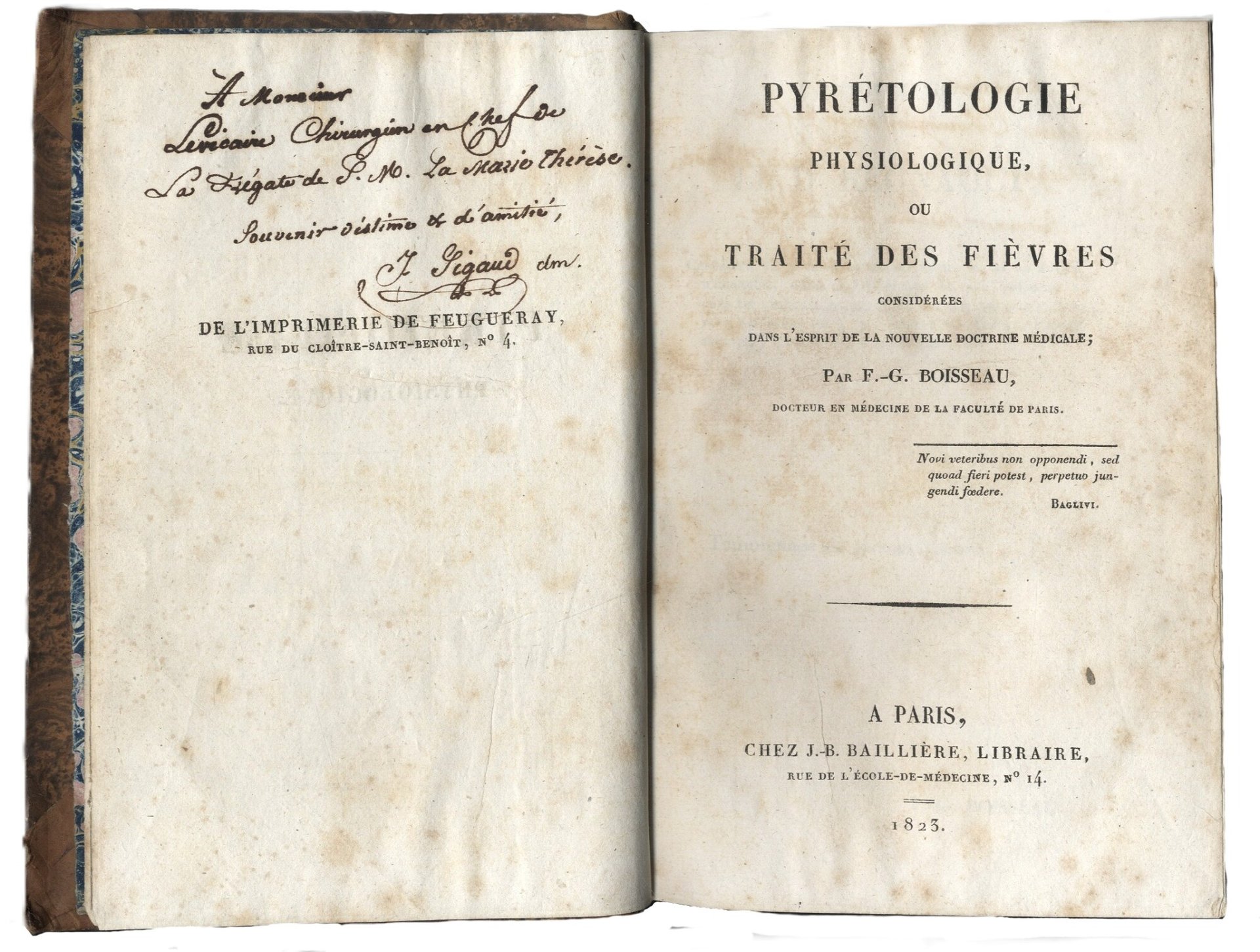 >in-8, pp. (8), 608, legatura coeva in mezza pelle e angoli, al dorso impressioni a secco e tassello granata con titolo in oro, tagli marmorizzati. Prima edizione di una delle più celebri opere del medico militare François Gabriel Boisseau (1791-1836), che fu anche uno dei principali redattori del ''Journal universel des sciences du medicales''. Buon esemplare (qualche fioritura, più pronunciata ai primi ff.) nota di possesso di mano coeva al verso dell'occhietto: "A monsieur Levicaire (?) chirurgien en chef de la frégate de S.M. La Marie Thérère, souvenir d'estime et d'amitié, J. Sigaud dm". Manca a Wellcome.