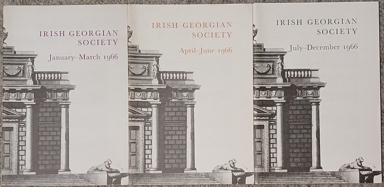 No marks or inscriptions. No creasing to cover. Three very clean very tight copies with bright unmarked boards and no bumping to corners. Total of 106pp. Three issues, January-March, April-June and July-December. Feature include Riverstown House, Co Cork and the Francini, Portrait of James Gandon architect 1743-1823, Wheatley in Ireland. The Irish Georgian Society and some houses, the Edifying Bishop - Fredrick Augustus, and the life and work of JE Carew.