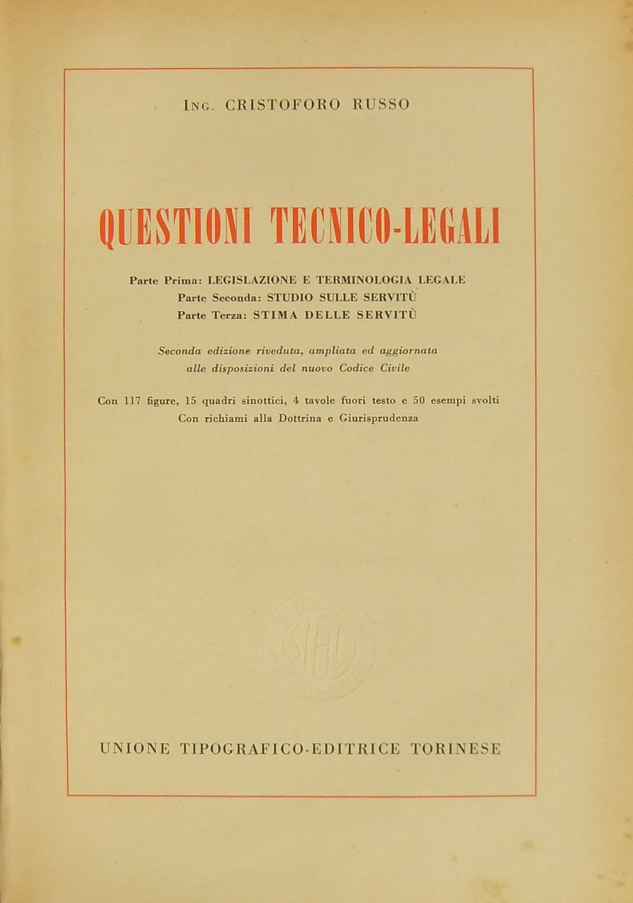 Questioni tecnico-legali. Parte prima legislazione e terminologia legale. Parte seconda studio sulle servitù. Parte terza stima delle servitù. Con 117 figure 15 quadri sinottici 4 tavole fuori testo e 50 esempi svolti. Con richiami alla Dottrina e Giurisprudenza | Libri antichi e moderni | Russo Cristoforo