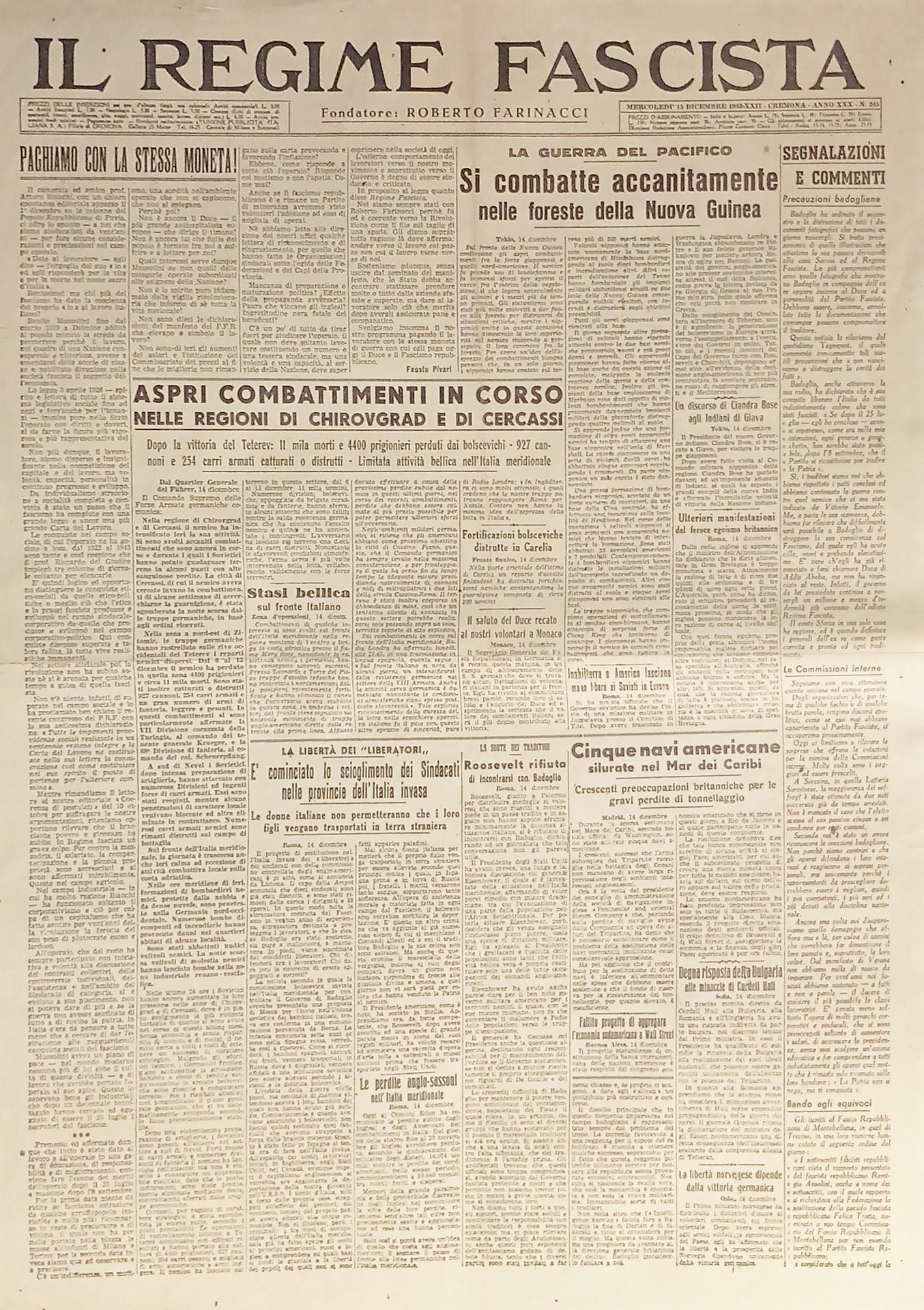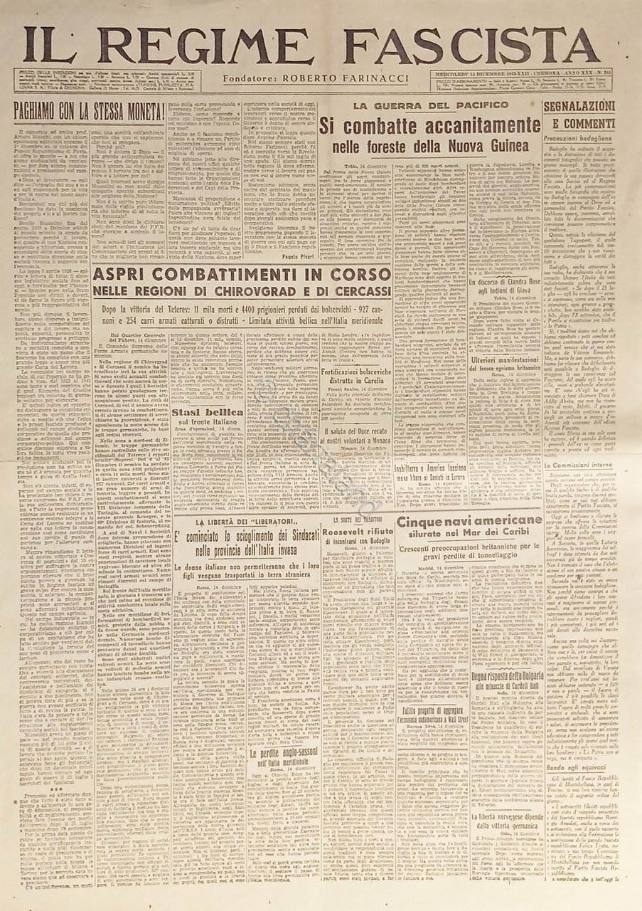 Quotidiano - Il Regime Fascista n. 245 - 1943 Aspri combattimenti in corso