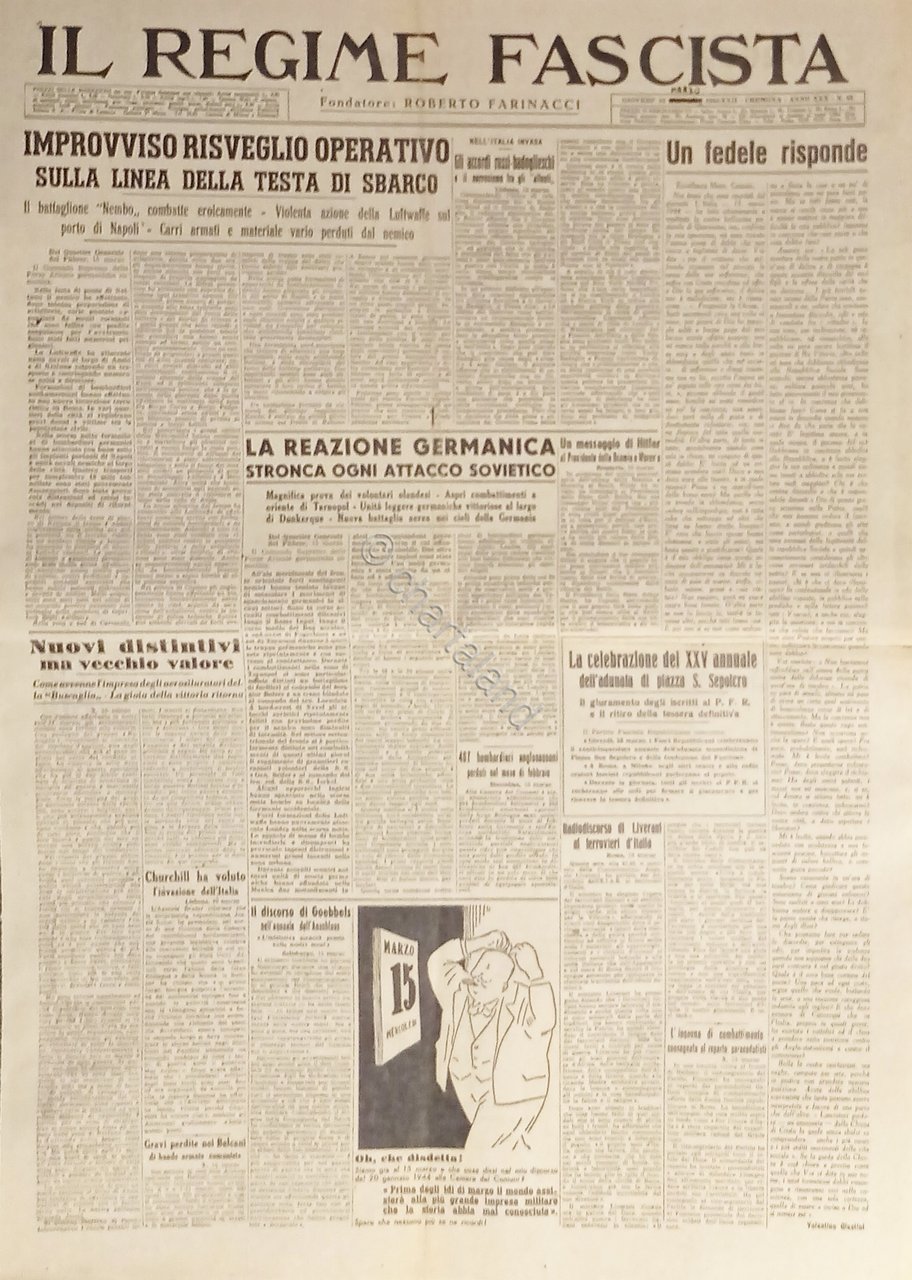 Quotidiano Il Regime Fascista n. 65 - 1944 Risveglio sulla testa di sbarco