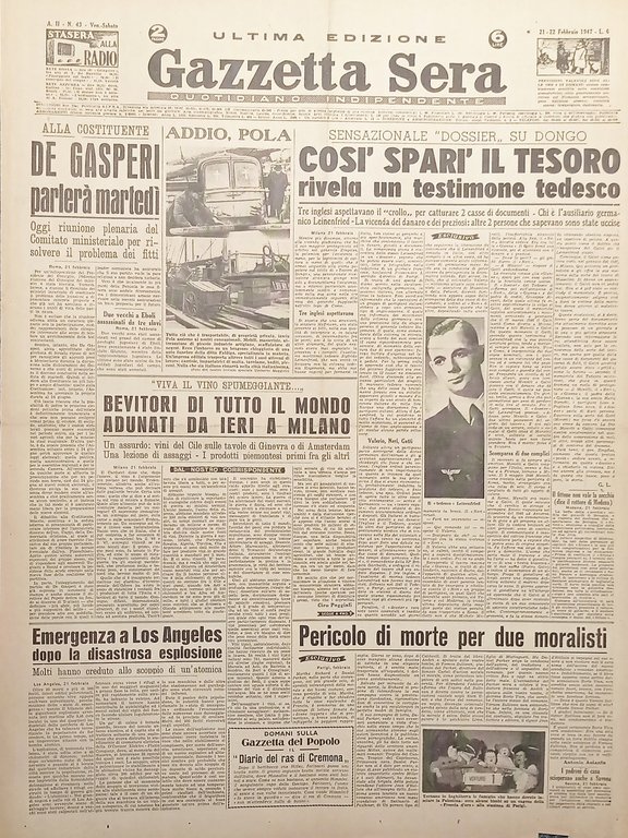 Quotidiano Indipendente - Gazzetta Sera N. 43 - Parlerà De Gasperi - 1947
