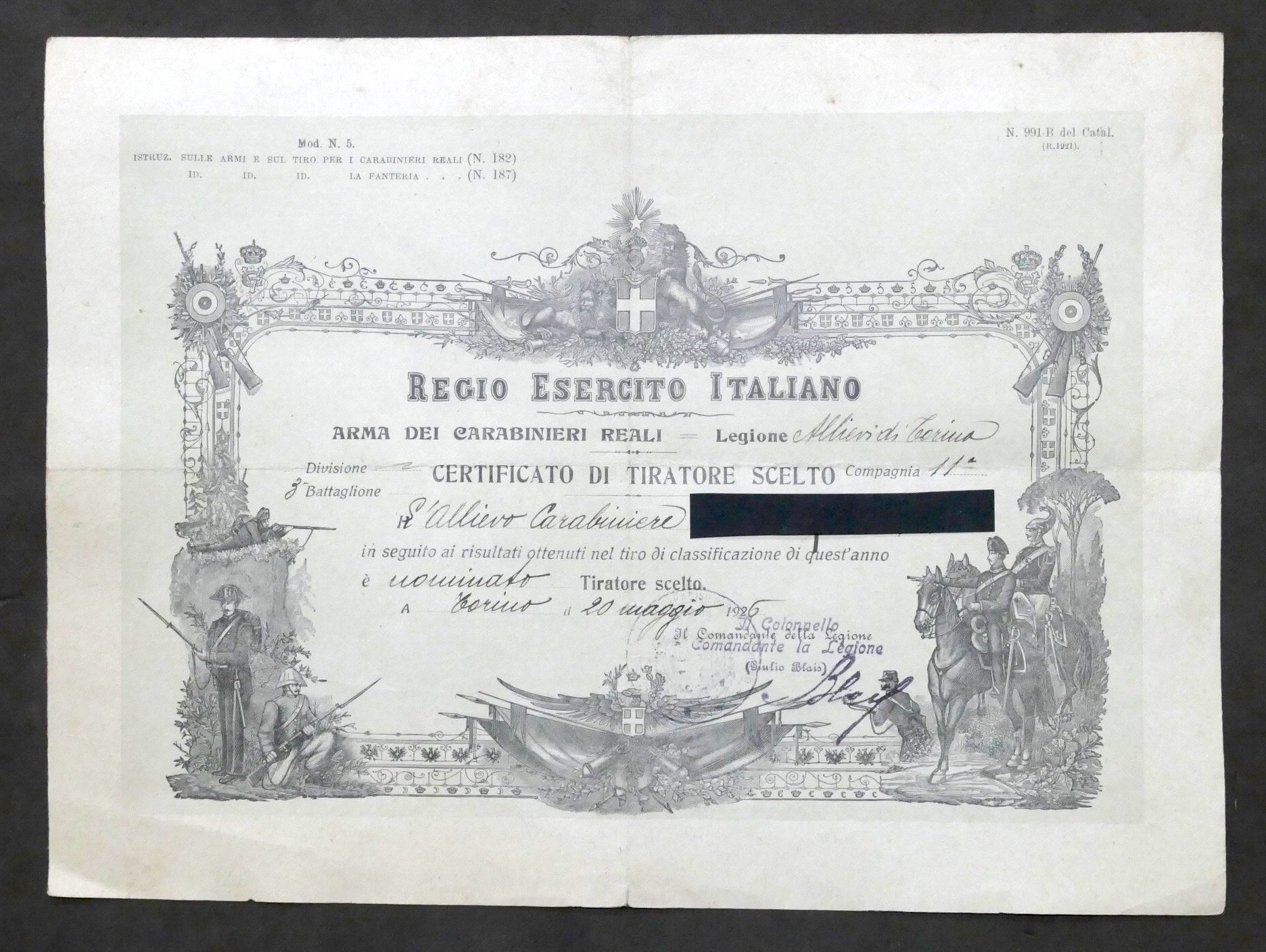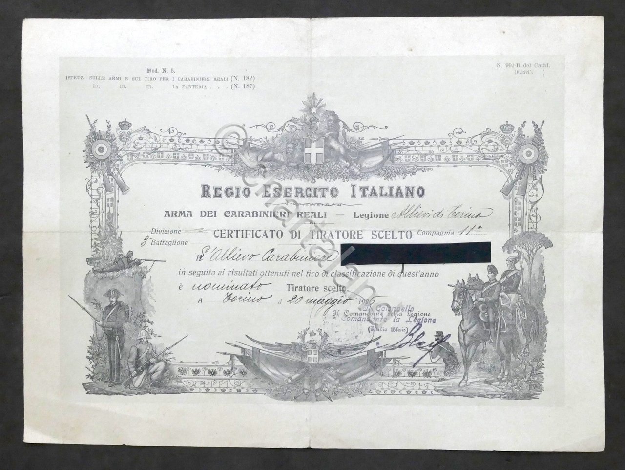 Regio Esercito Italiano - Arma Carabinieri Reali - Legione Allievi di Torino - Comapagnia 11^ - 3° Battaglione - Certificato di Tiratore Scelto - DAtato Torino, 20 Maggio 1926 Dimensioni: 22 x 30 cm ca. Condizioni generali molto buone.
