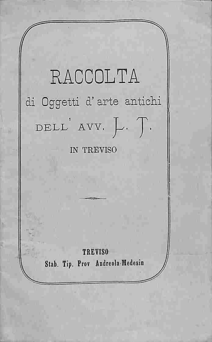 In 16 (cm 11,5 x 18,5), pp. 16. Brossura editoriale. Opuscolo non datato, ma ascrivibile alla meta' dell'800, comprendente la collezione di dipinti e di oggetti di un avvocato di Treviso menzionato solamente attraverso le iniziali del nome, L. T., e non identificato. La collezione comprende: mobili scolpiti e in tarsia, mobili intarsiati in avorio appartenenti alla famiglia patrizia Farseti eredi Rezzonico, dipinti, oggetti in bronzo, maioliche italiane ed estere, vetri di Murano, porcellane cinesi e giapponesi.