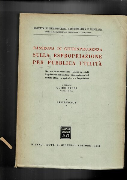 Rassegna di giurisprudenza sulla espropriazione per pubblica utilità. Norme fondamentali, leggi speciali, legislazione urbanistica, espropriazione ed istituti affini in agricoltura, requisizioni. Appendice. | Libri antichi e moderni | Landi Guido A Cura.