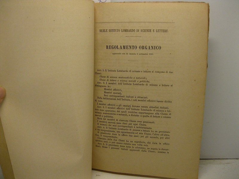 Reale Istituto Lombardo di Scienze e Lettere. Regolamento approvato con R. decreto 5 settembre 1863. | Libri antichi e moderni |