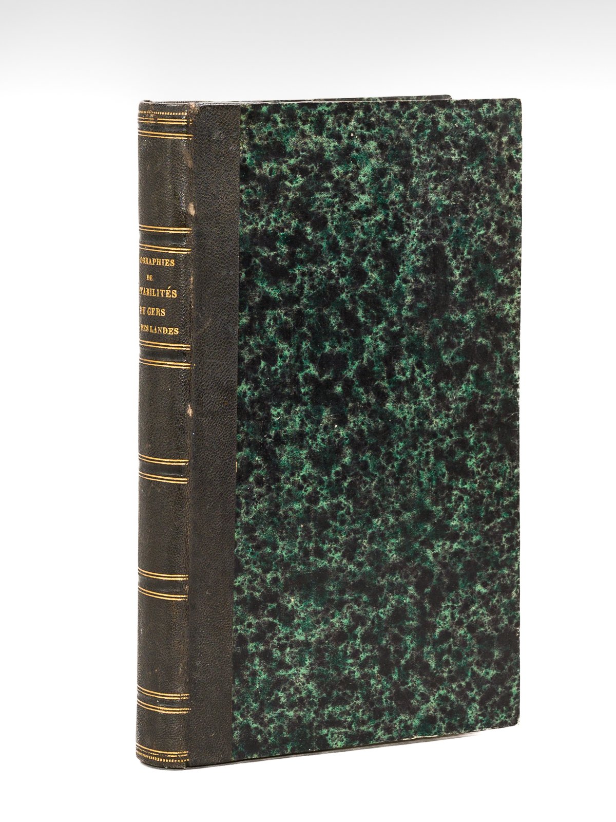 1 vol. in-8 reliure de l'époque demi-chagrin noir, Notice historique sur François de Bastard, comte d'Estang, pair de France, Imprimerie de Schneider et Langrand, Paris, Mai 1844, 101 pp. [ Edition originale ] [ Suivi de : ] Notice biographique et historique, sur le Général J.-B. Dupin, Baron de l'Empire, Ancien Colonel des Chasseurs à Pied de la Garde, Imprimerie et Librairie Administratives de Paul Dupont, Paris, 1851, 59 pp. avec portrait en frontispice [ Edition originale ] [ Suivi de : ] Notice biographique sur M. Lacave-Laplagne-Barris, Président à la Cour de Cassation, Ancien Pair de France, Imprimerie et Librairie Générale de Jurisprudence Cosse et Marchal, Paris, 1860, 108 pp. et 1 f. [ Edition originale - Livre dédicacé par l'auteur ] [ Suivi de : ] Précis historique sur la Vie et les Travaux de Jean Darcet, Membre du Sénat Conservateur de l'Institut National, etc., lu à la Séance publique du Lycée des Arts, le 10 germinal an 10, par Michel-J.-J. Dizé, De l'Imprim. de Gillé, Paris, An X, 36 pp. [ Edition originale ] [ Suivi de : ] Eloge historique de Jean-Charles Borda, Membre de l'Institut national, né à Dax, département des Landes, le 4 mai 1733, lu à la Société philomatique par S. F. Lacroix, De l'Imprimerie de R. Jacquin, s.d., 40 pp. [ Edition originale ] [ Suivi de : ] Eloge historique de Jean-Jacques Lamarque, Vicaire Général du Diocèse de Bayonne, suivi d'une Notice sur la vie de M. l'Abbé Bilhère, Supérieur Général des Missions Etrangères, par M. l'Abbé Desmazures, Chez Adrien Le Clère, Paris, 1809, 28 pp. Beau recueil réunissant l'édition originale de 6 publications, parfois très rares, consacrées à des personnalités du Gers ou des Landes. Bon exemplaire.