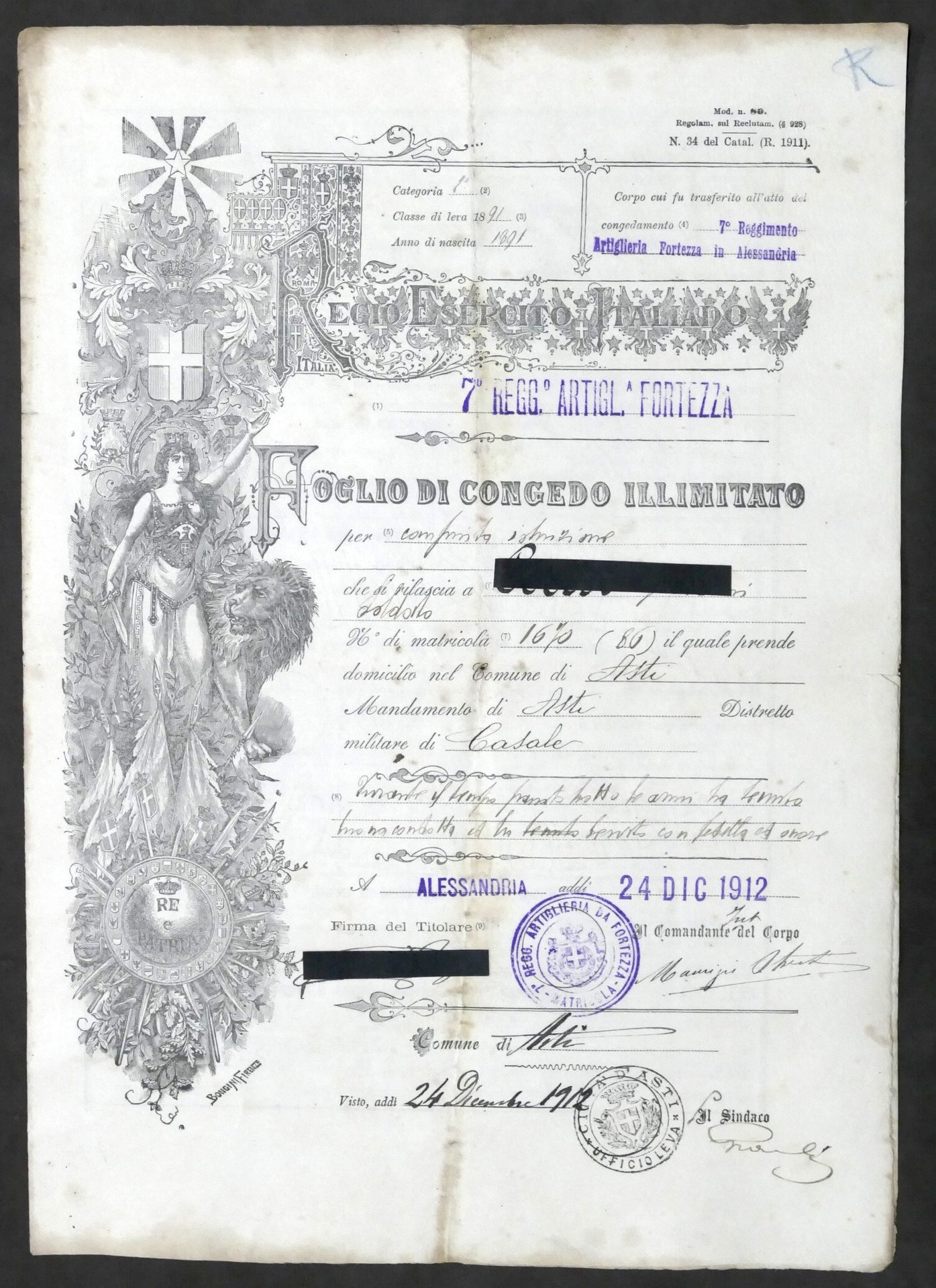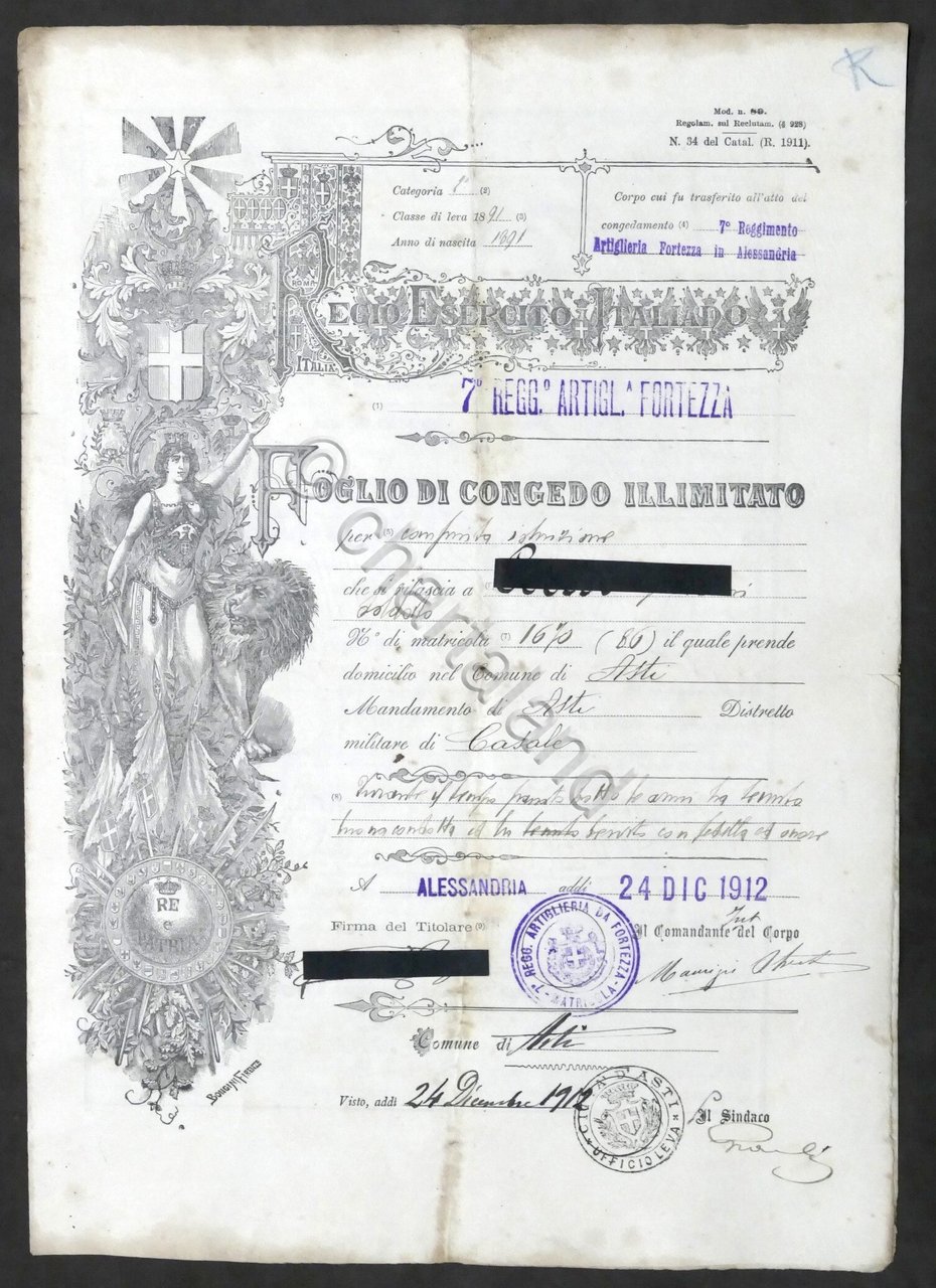 Regio Esercito Italiano - Foglio di Congedo illimitato - Comune di Asti - 1912