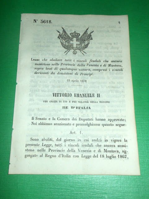 Regno d' Italia Legge che Abolisce Vincoli Feudali Prov. Venezia e Mantova 1870