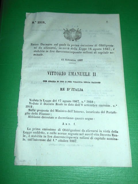 Regno d' Italia Regio Decreto Emissione di Obbligazioni da alienarsi 1867 | Libri antichi e moderni |
