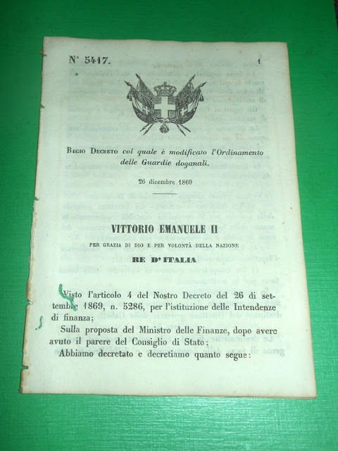 Regno d' Italia Regio Decreto Modifiche Ordinamento della Guardie Doganali 1869 | Libri antichi e moderni |