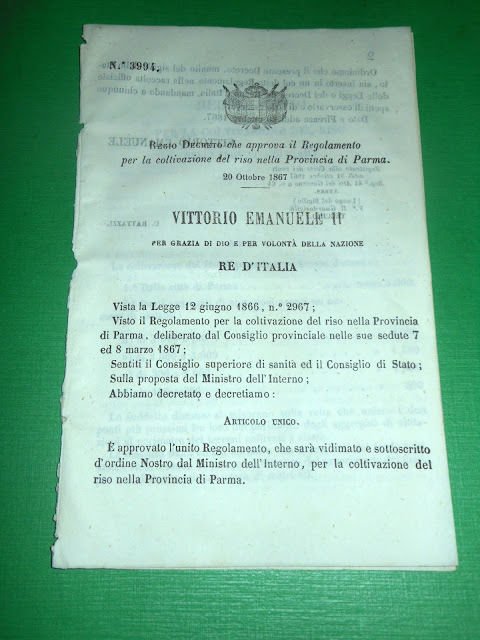 Regno d' Italia Regio Decreto Regolamento Coltivazione Riso Prov. di Parma 1867