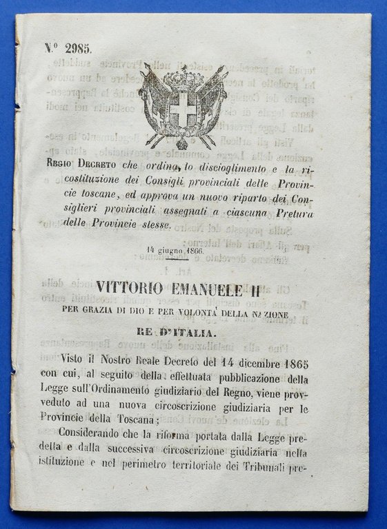 Regno d'Italia Regio Decreto Ricostituzione Consigli Province toscane 1866 | Libri antichi e moderni |