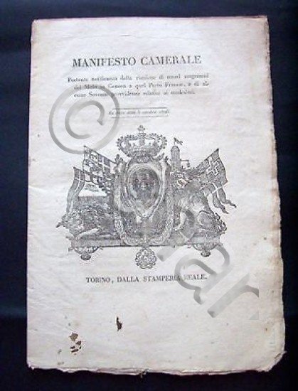 *** Bello ed interessante documento/decreto d' epoca:Manifesto Camerale "portante notificanza della riunione di nuovi magazzeni del Molo in Genova a quel di Porto Franco, e di alcune sovrane provvidenze relative ai medesimi ..."Il decreto è datato 5 ottobre 1826.Pagine 16 - dimensioni mm. 200 x 295 ca.Il documento e stato stampato su carta vergata.Per appassionati studiosi e collezionisti