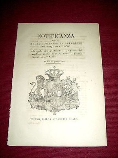 *** Atti del Governo di S. M. il Re di Sardegna: Notificanza della Regia Commissione Superiore di Liquidazione colla quale vien pubblicato il 5° Elenco dei creditori sudditi di S. M. verso la Francia cadenti in 2^ Classe ." Torino, 26 gennaio 1826. Pagine 12.Per appassionati studiosi e collezionisti"