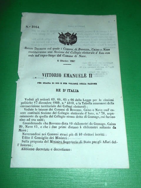 Regno Regio Decreto Comuni di Bovezzo Caino e Nave Sezione Elettorale 1867