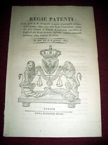 *** Regno di Sardegna: Regie Patenti colle quali S. M. derogando in parte al paragrafo settimo, titolo quinto, libro sesto delle Regie Costituzioni, ordina che d' or innanzi le Patenti d' immunità concedute ai Padri ed alle Madri di dodici figliuoli, saranno solamente interinate dalla Camera de' Conti .". Torino, 8 gennaio 1820. Pagine 8. Per appassionati studiosi e collezionisti"
