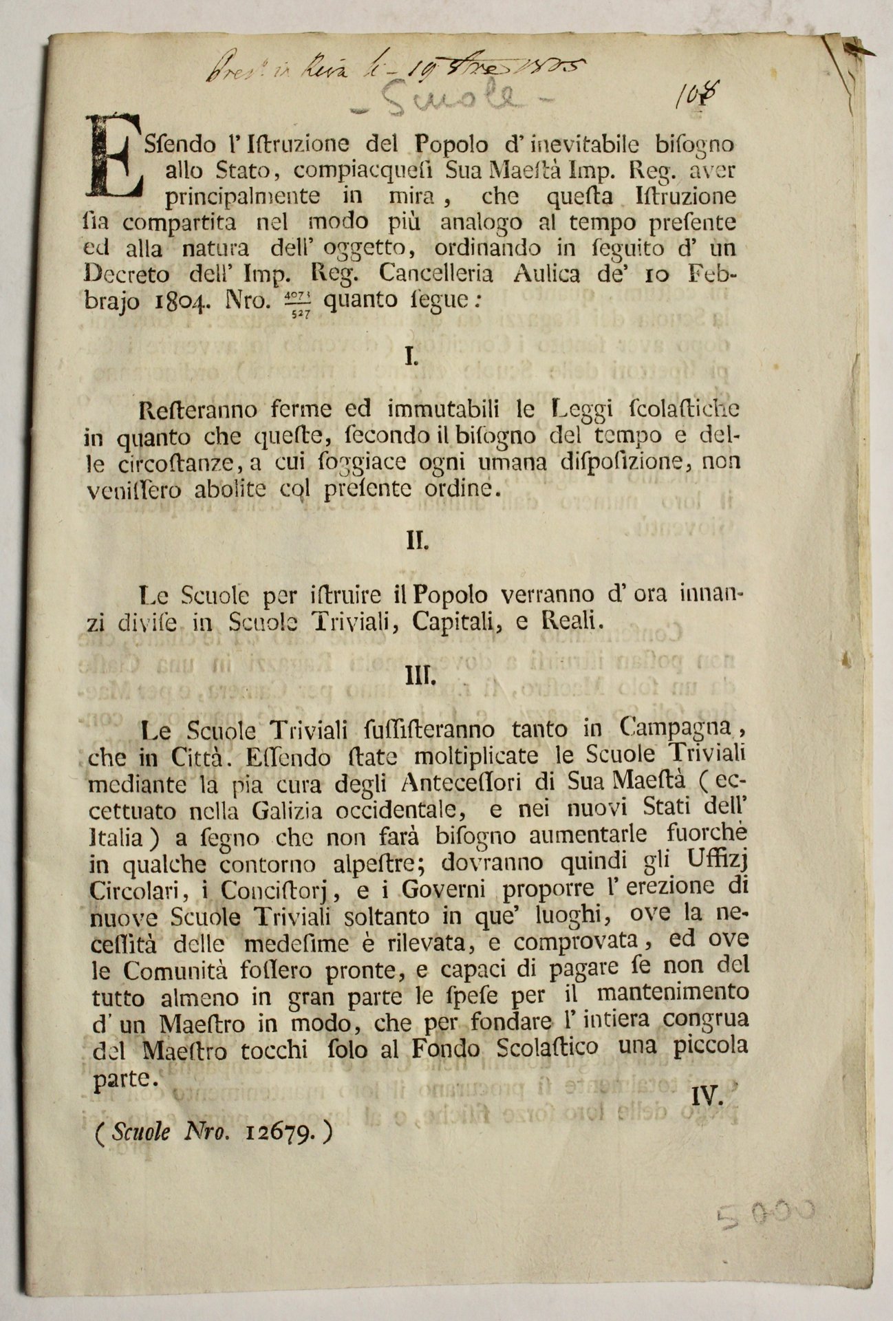In folio (mm 290x190); pagg. 24. Rilegato ma privo di copertina. Interessante regolamento in 40 articoli per le scuole emanato dalla Cancelleria aulica dell'impero asburgico il 10 febbraio 1804.<BR>Ottime condizioni.