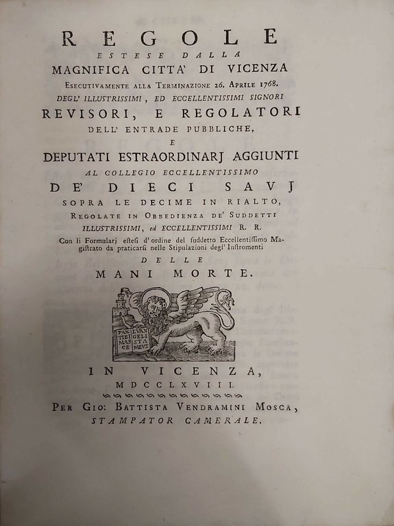 REGOLE ESTESE dalla Magnifica Città di Vicenza esecutivamente alla Terminazion 26 Aprile 1768 degl’Ill. ed Ecc. Signori Revisori, e Regolatori dell’Entrade pubbliche e Deputati Estraordinari aggiunti al Collegio Eccellentissimo de’ Dieci Savj sopra le Decime in Rialto. Con li Formulari estesi d’ordine del suddetto Eccellentissimo Magistrato da praticarsi nelle stipulazioni degl’Istromenti delle Mani Morte.