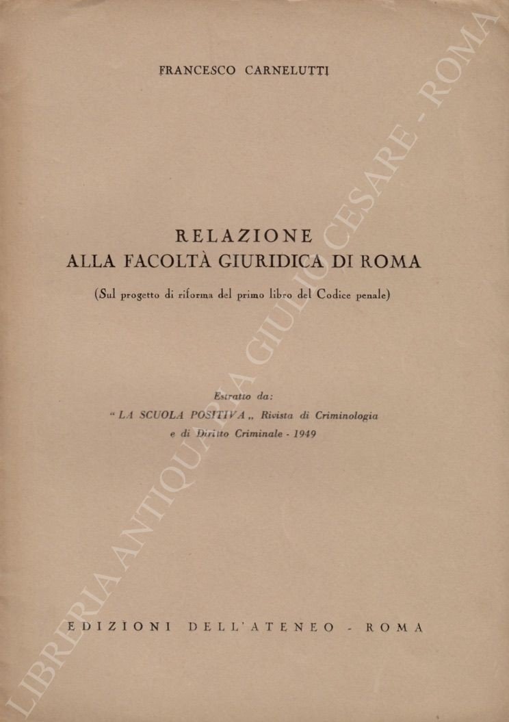 Relazione alla Facoltà Giuridica di Roma (Sul progetto di riforma del primo libro del Codice penale) | Libri antichi e moderni | Carnelutti Francesco (1879-1965)