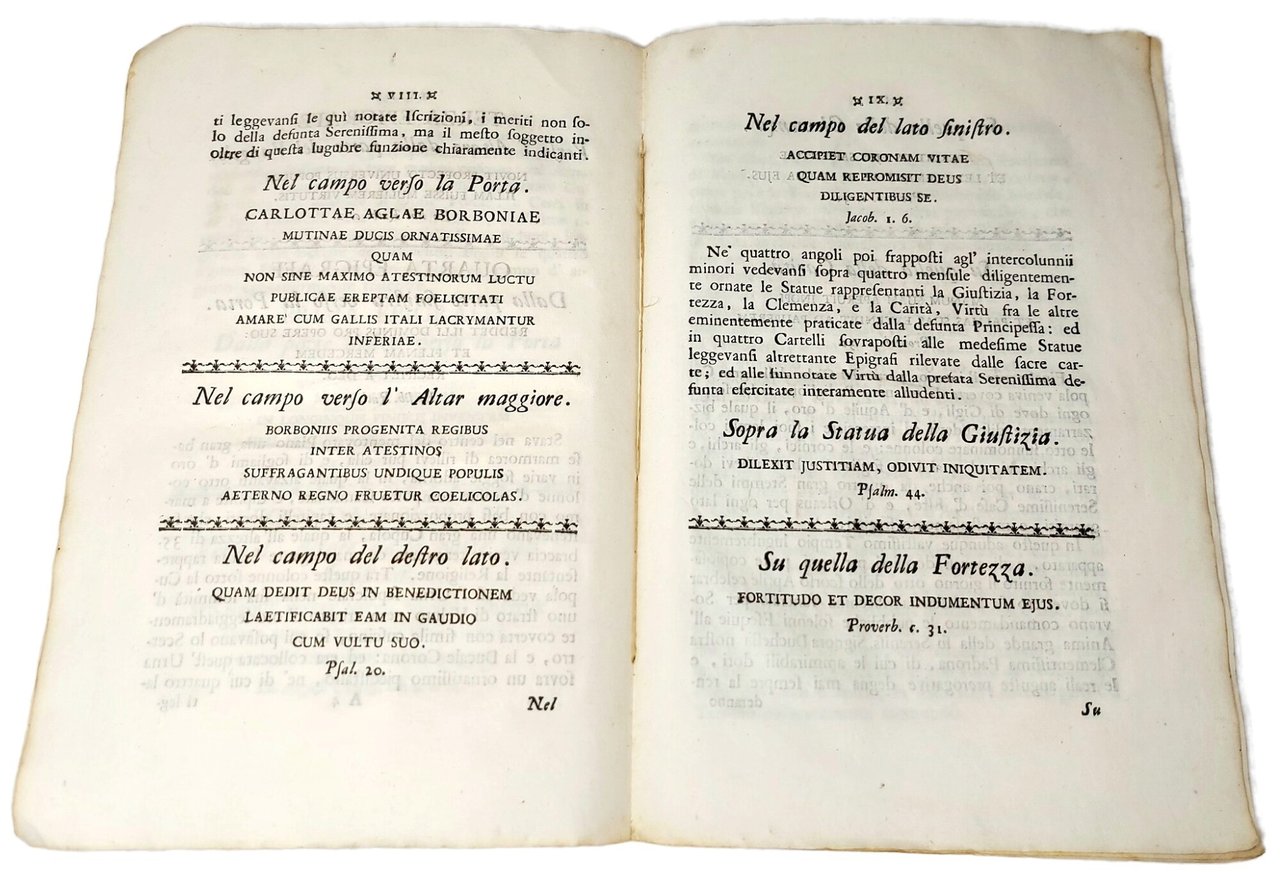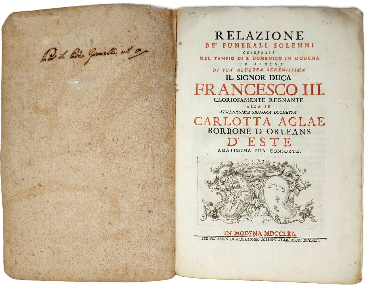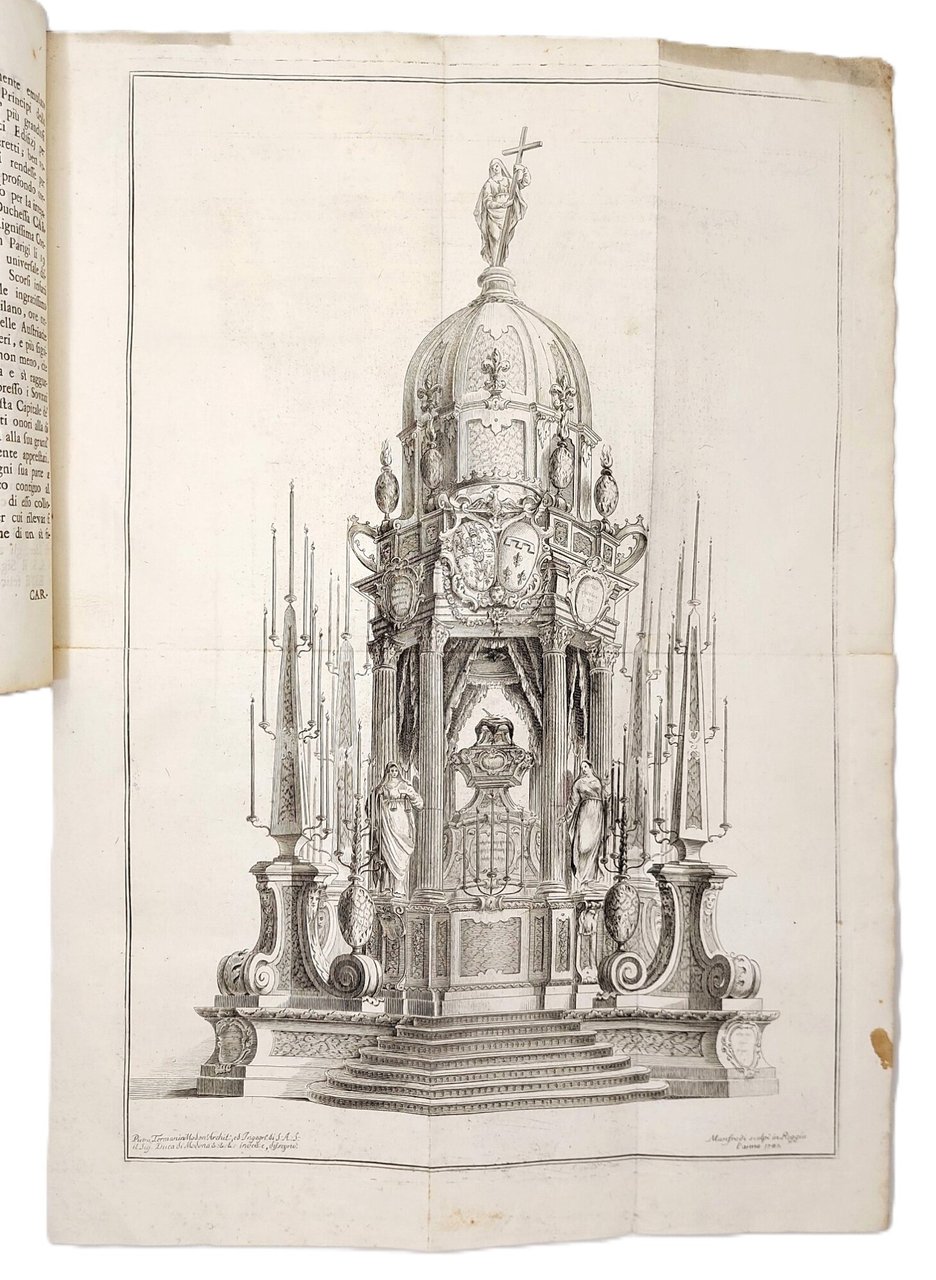 >in-folio (mm 333x210), pp. XXXVI ed una grande tavola ripiegata f.t. Legatura coeva in cartonato rivestito in carta marmorizzata. Frontespizio impresso in rosso e nero, nella parte inferiore un'incisione in rame raffigurante gli stemmi delle due casate. Adorno di una grande tavola incisa più volte ripiegata (mm. 573x405) raffigurante il grande monumento funerario, firmata lungo il margine inferiore: Pietro Termianini Modon Archit, ed Ingegn di S.A.S. Il Sig. Duca di Modona &: inven e, disegnò-Manfredi scolpì in Reggio l'anno 1761. Dettagliata descrizione della cerimonia seguita dall'Orazione "In morte della Serenissima Principessa Carlotta Aglae Borbone d'Orleans d'Este Duchessa di Modena orazione del P. Giovanni Granelli della Compagnia di Gesù". Lievi aloni di umidità al frontespizio ma nel complesso buon esemplare, uno dei riservati a Granelli dall'editore come si desume dalla nota ms. al contropiatto anteriore.