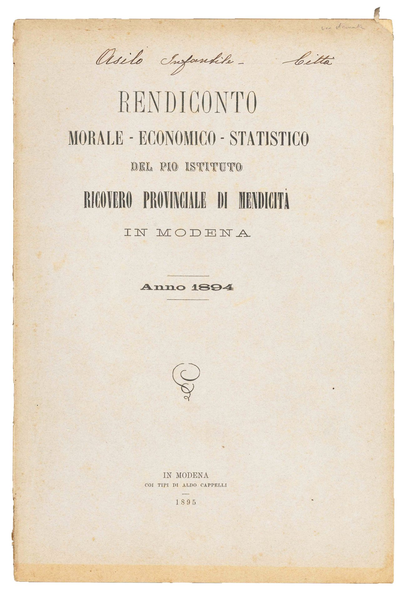 Rendiconto morale economico statistico del Pio istituto Ricovero di mendicità di Modena. Anno 1894. | Libri antichi e moderni | ISTITUTO RICOVERO DI MENDICITA DI MODENA
