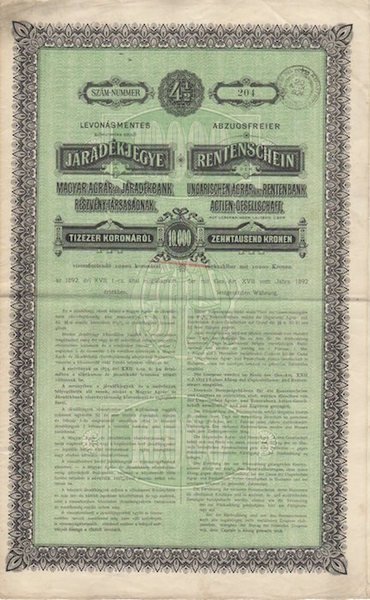 Rentschein ungarischen Agrar und Rentenbank Actien-Gesellschaft: 2000 koronarol: tizezer koronarol. | Libri antichi e moderni | [Royal Hungarian Bond].