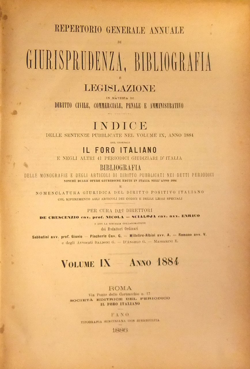 Repertorio Generale Annuale del Foro Italiano. Vol. IX - Anno 1884 | Libri antichi e moderni | Il Foro Italiano