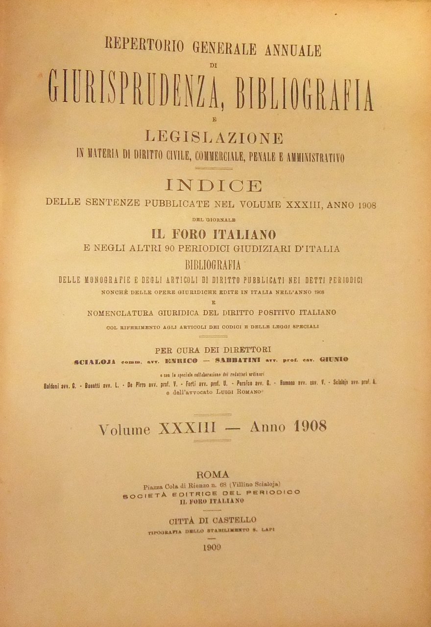 Repertorio Generale Annuale del Foro Italiano. Vol. XXXIII - Anno 1908 | Libri antichi e moderni | Il Foro Italiano