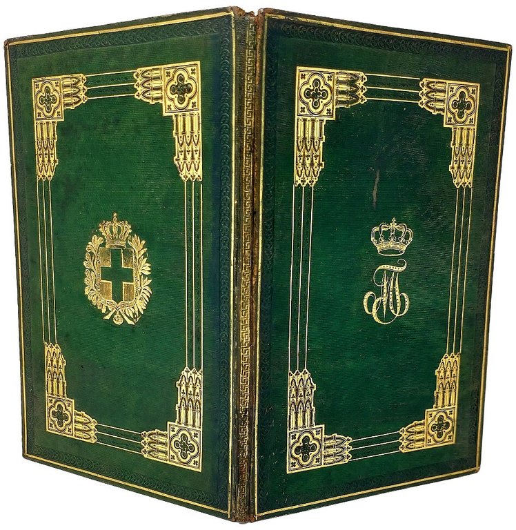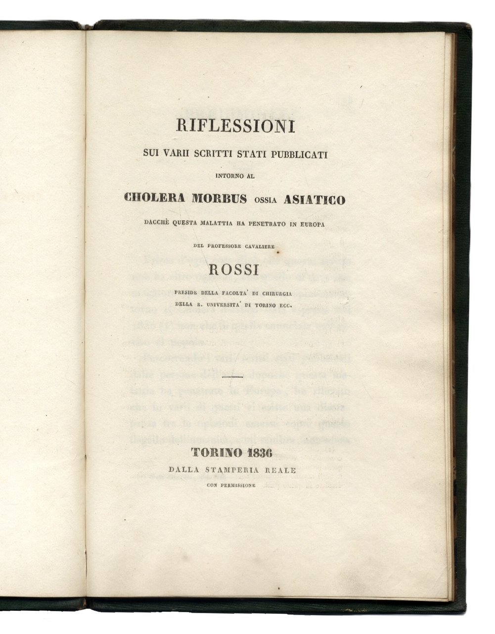 >in-8, pp. 23. Preziosa legatura Sabauda alle Armi di Maria Teresa di Savoia (1803-1879). Edizione originale, rarissima, di questo trattato sul colera ad opera del Professor Cavaliere Rossi, preside della facoltà di chirurgia della Regia Università di Torino. Ottimo esemplare, marginoso e impresso su carta forte, in fine, nota ms. di Errata, probabilmente di mano dell'Autore che omaggiò il suo libro alla principessa .