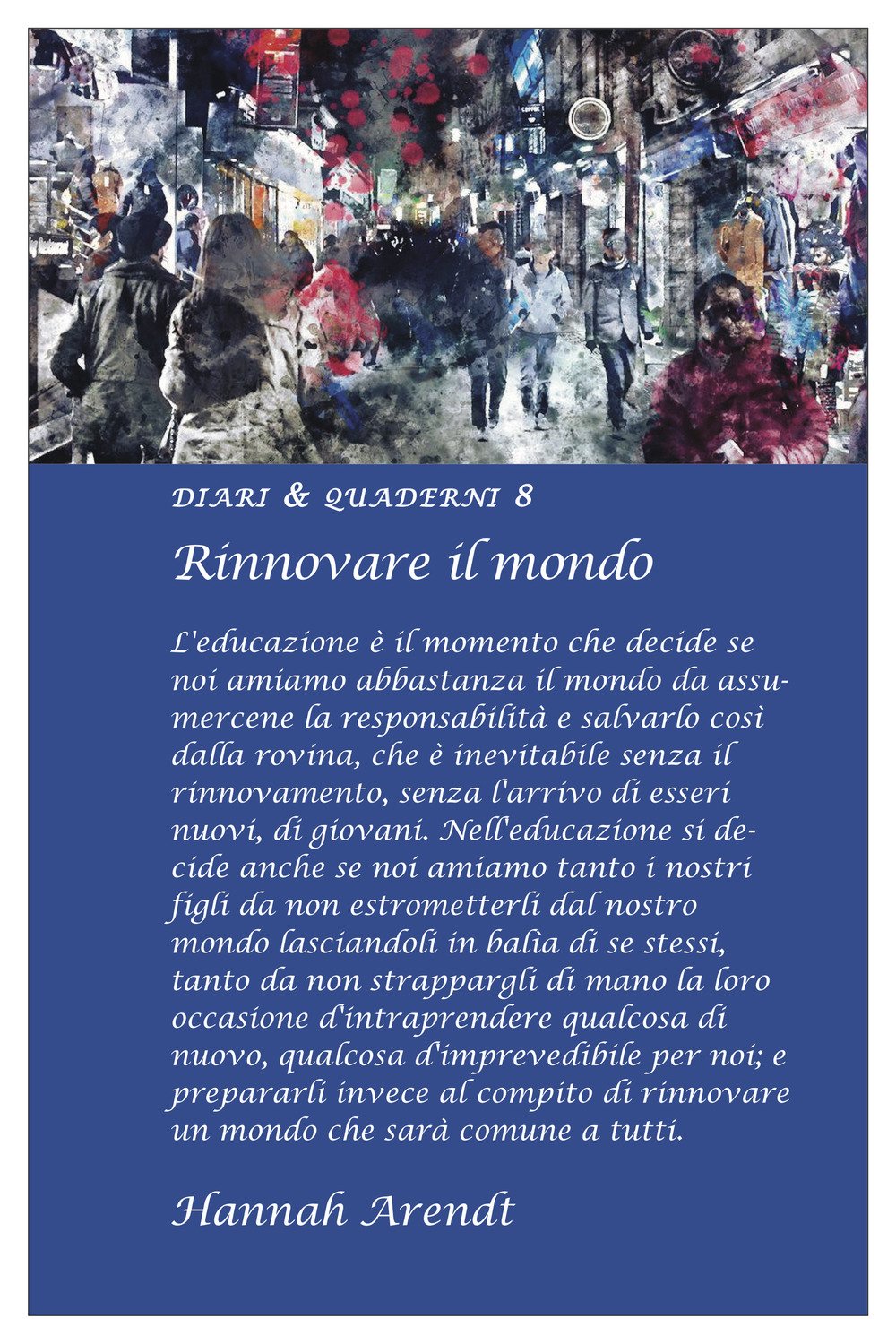"L'educazione è il momento che decide se noi amiamo abbastanza il mondo da assumercene la responsabilità e salvarlo così dalla rovina, che è inevitabile senza il rinnovamento, senza l'arrivo di esseri nuovi, di giovani. Nell'educazione si decide anche se noi amiamo tanto i nostri figli da non estrometterli dal nostro mondo lasciandoli in balìa di se stessi, tanto da non strappargli di mano la loro occasione d'intraprendere qualcosa di nuovo, qualcosa d'imprevedibile per noi; e prepararli invece al compito di rinnovare un mondo che sarà comune a tutti." (Hannah Arendt).