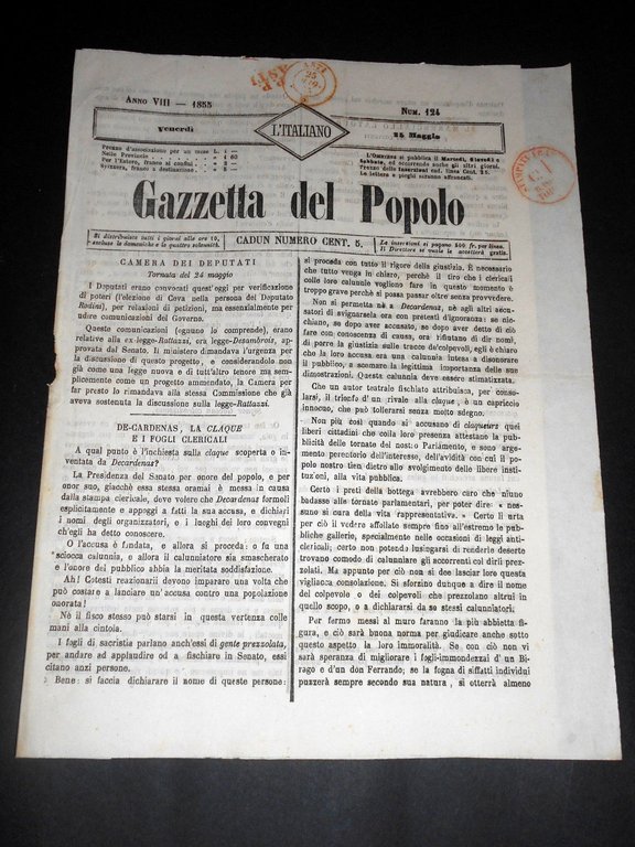 Risorgimento Cavour Torino - Giornale Gazzetta del Popolo n° 124 del 1855 | Libri antichi e moderni |