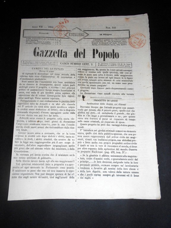 Risorgimento Cavour Torino - Giornale Gazzetta del Popolo n° 144 del 1854 | Libri antichi e moderni |