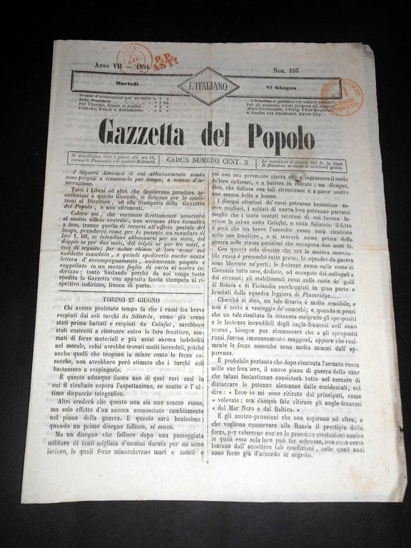 Risorgimento Cavour Torino - Giornale Gazzetta del Popolo n° 153 del 1854 | Libri antichi e moderni |