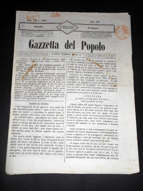 Risorgimento Cavour Torino - Giornale Gazzetta del Popolo n° 155 del 1854 | Libri antichi e moderni |