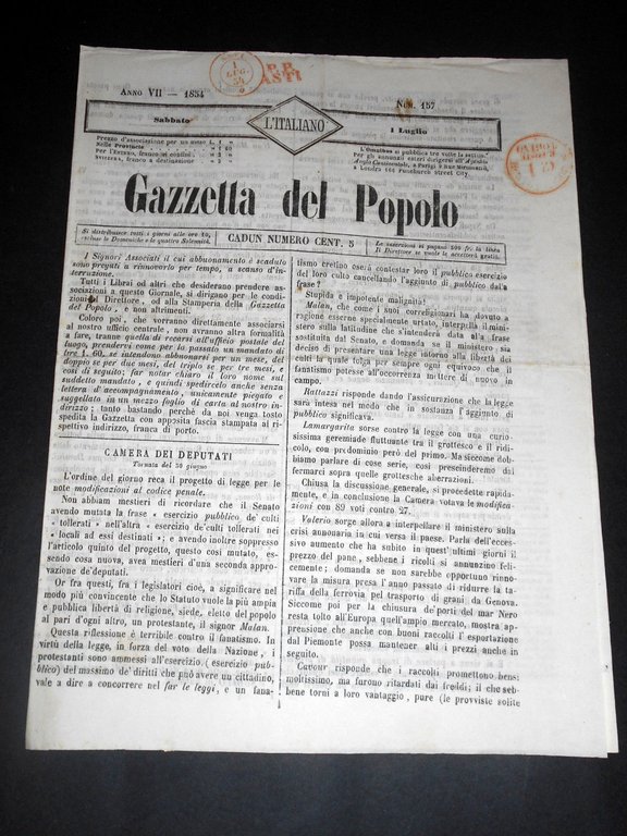 Risorgimento Cavour Torino - Giornale Gazzetta del Popolo n° 157 del 1854 | Libri antichi e moderni |