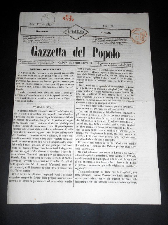Risorgimento Cavour Torino - Giornale Gazzetta del Popolo n° 160 del 1854 | Libri antichi e moderni |