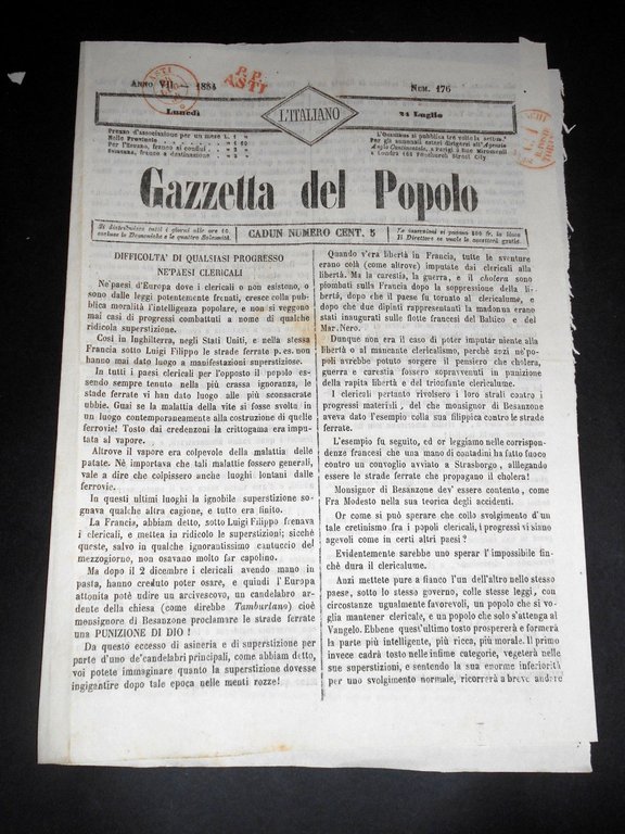 Risorgimento Cavour Torino - Giornale Gazzetta del Popolo n° 176 del 1854 | Libri antichi e moderni |