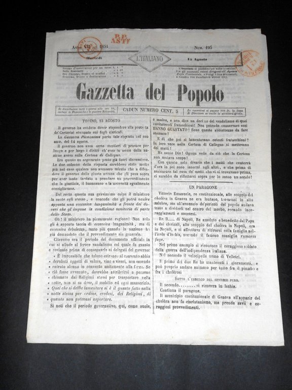 Risorgimento Cavour Torino - Giornale Gazzetta del Popolo n° 195 del 1854 | Libri antichi e moderni |