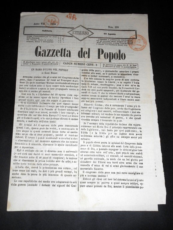 Risorgimento Cavour Torino - Giornale Gazzetta del Popolo n° 199 del 1854 | Libri antichi e moderni |