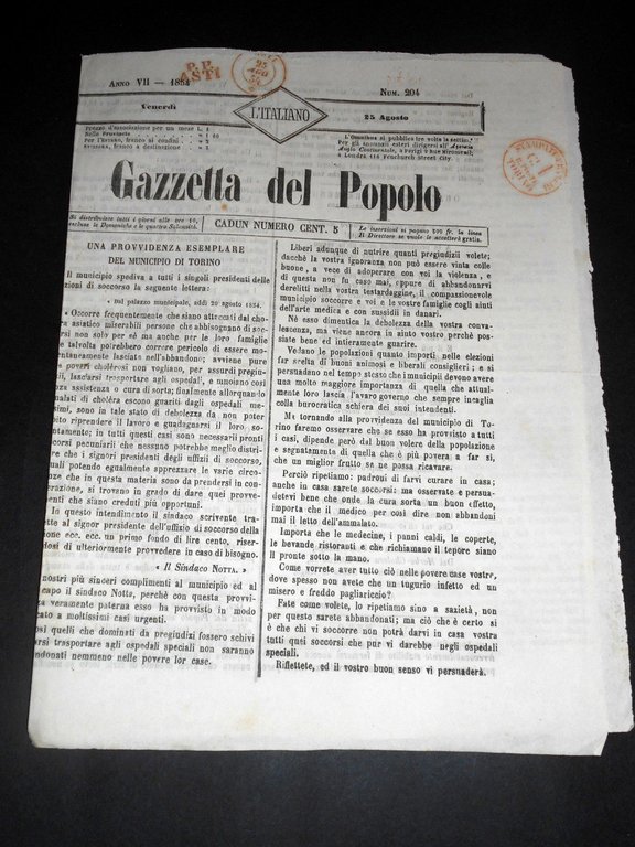 Risorgimento Cavour Torino - Giornale Gazzetta del Popolo n° 204 del 1854 | Libri antichi e moderni |