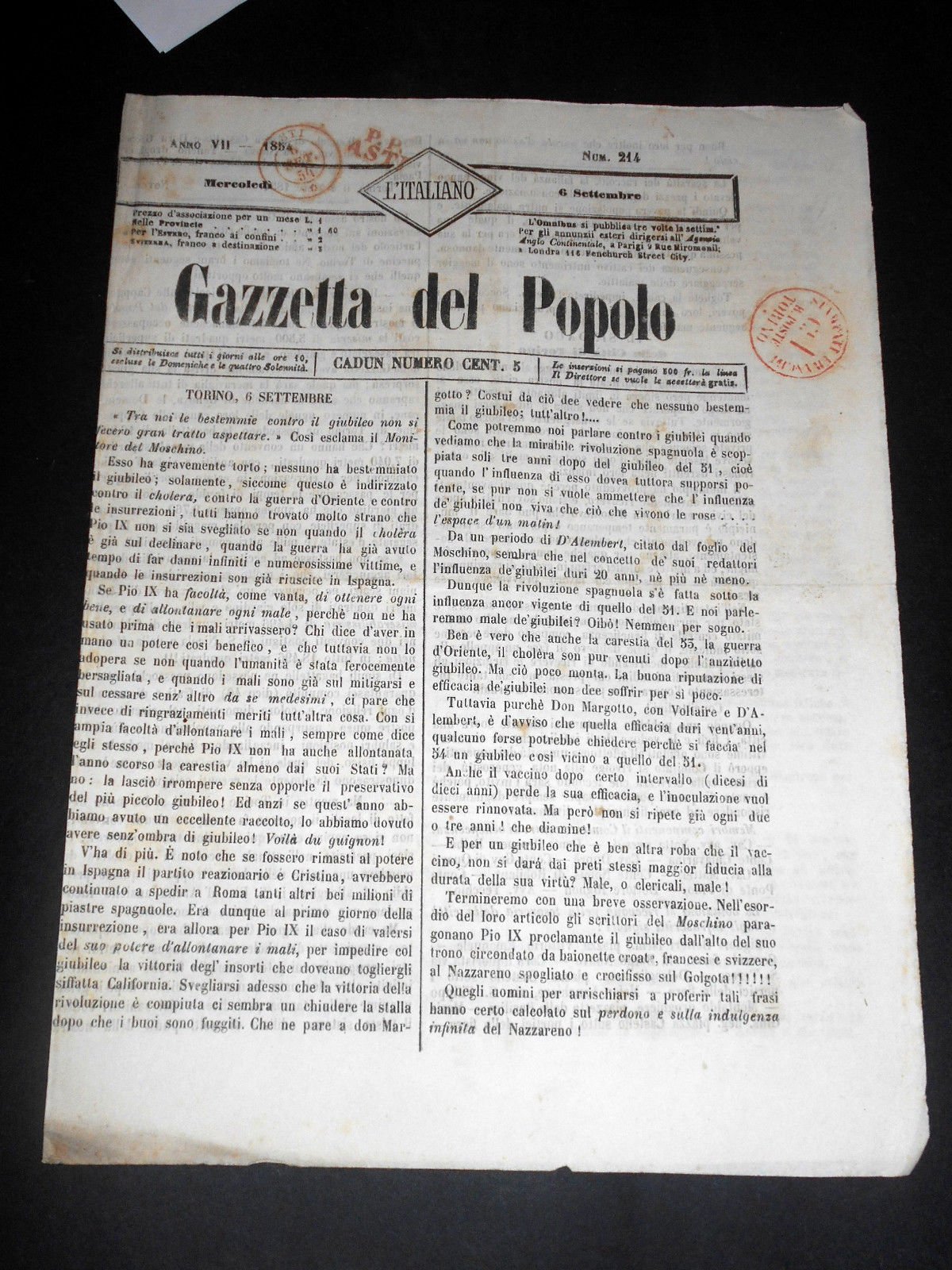 Risorgimento Cavour Torino - Giornale Gazzetta del Popolo n° 214 del 1854 | Libri antichi e moderni |