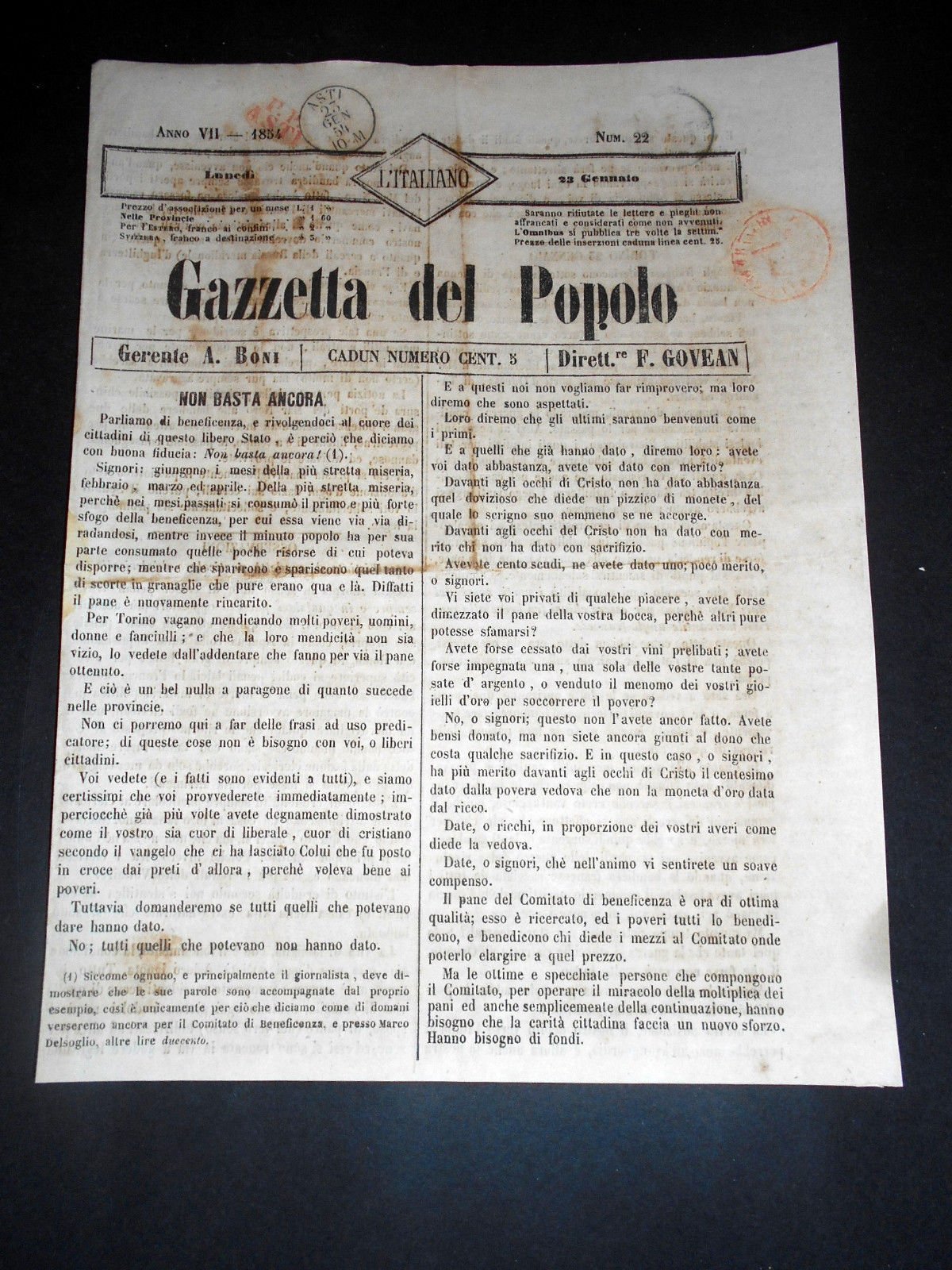 Risorgimento Cavour Torino - Giornale Gazzetta del Popolo n° 22 del 1854 | Libri antichi e moderni |