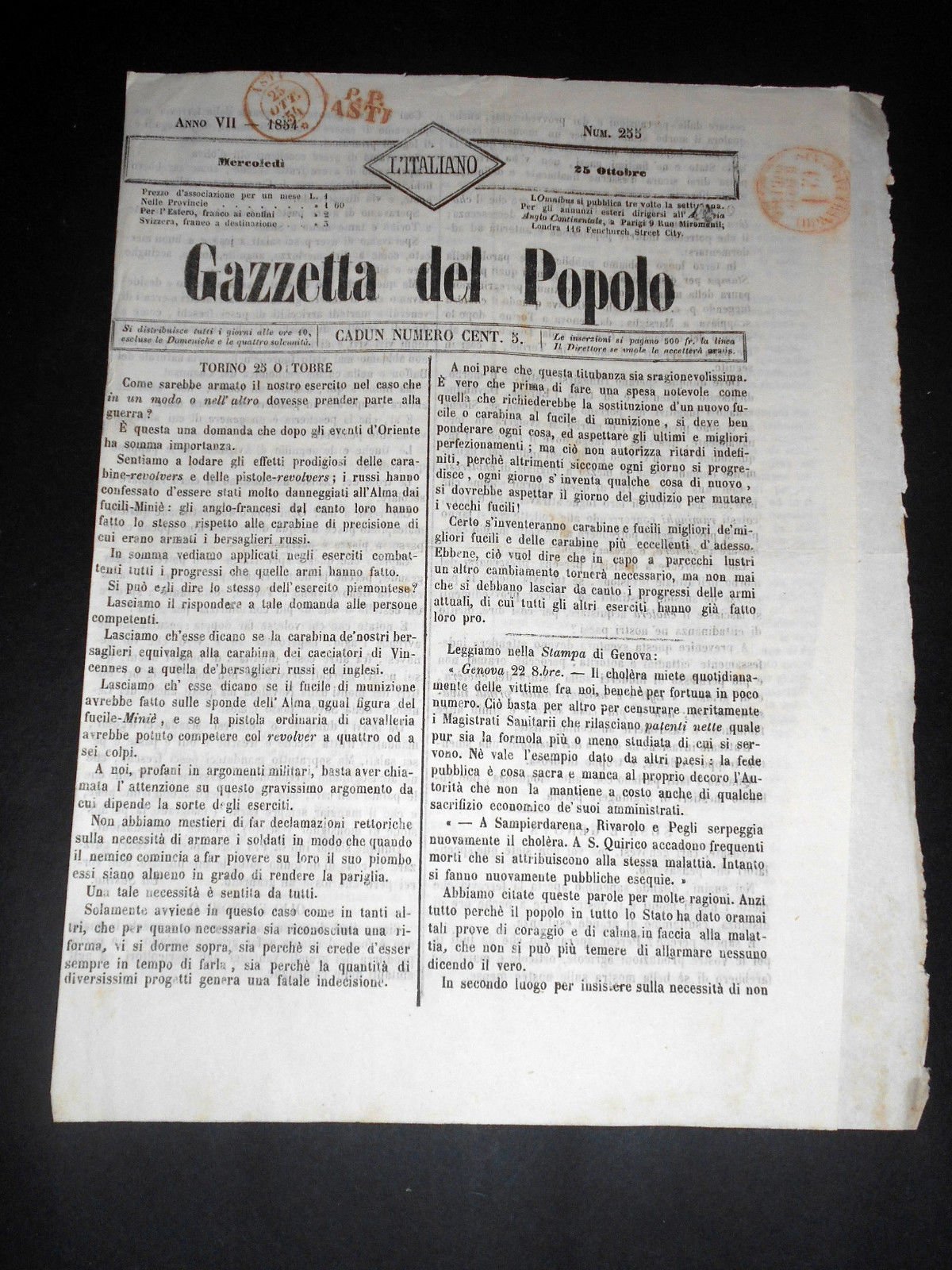 Risorgimento Cavour Torino - Giornale Gazzetta del Popolo n° 255 del 1854